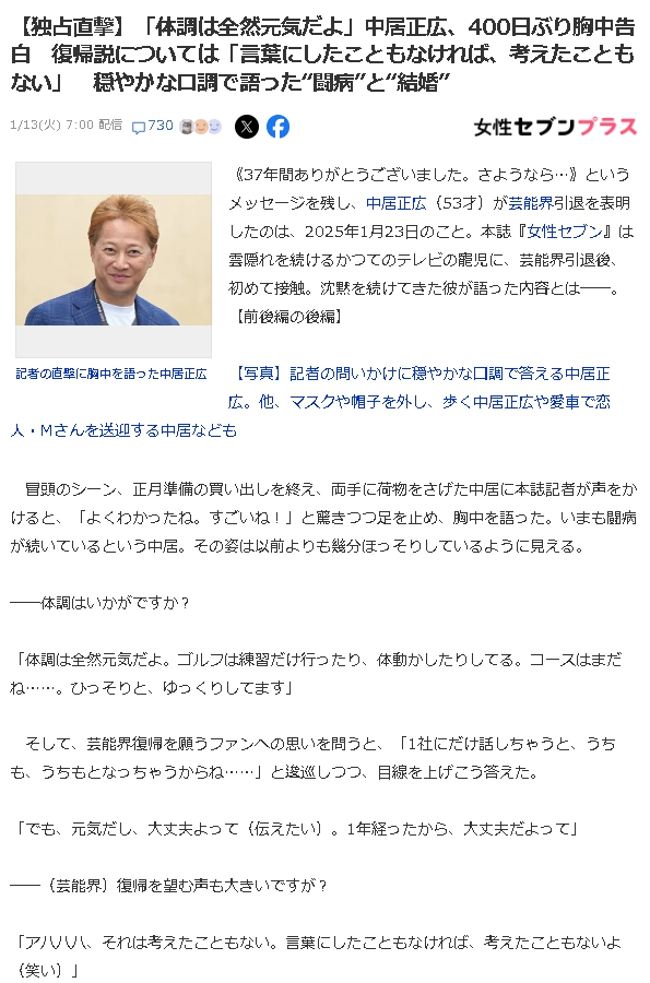 元SMAP・中居正広さん(53歳)、約400日ぶりにマスコミ取材に対応。世間に顔出しした事で、話題になっております。